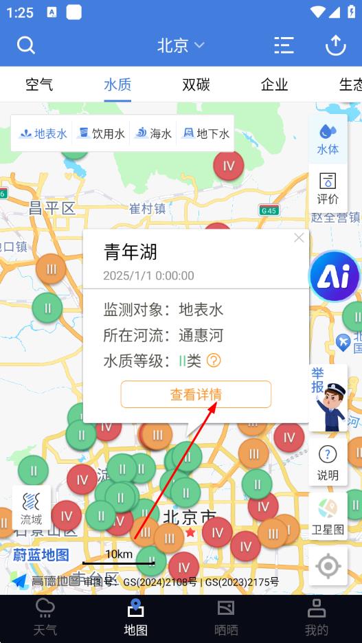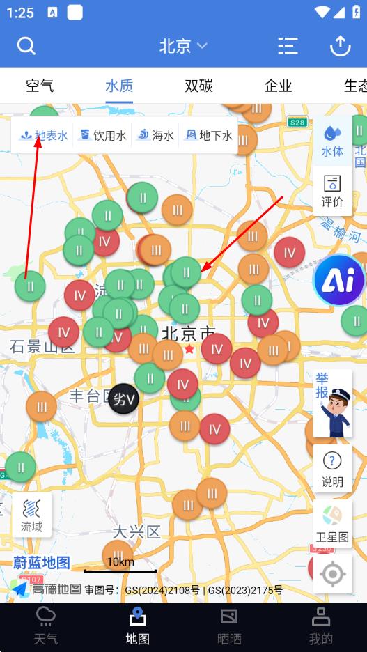 3、在水质地图界面,点击筛选按钮选择地表水,地图上会显示各地表水监测点,点击你想要查询的监测点。