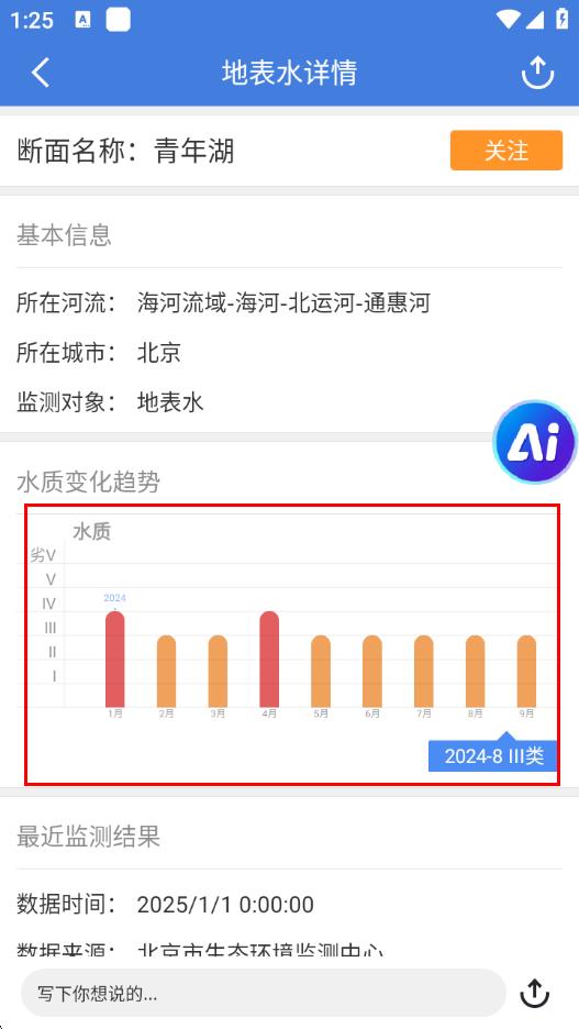 5、进入地表水详情页面,在水质变化趋势板块,可以查看以往不同月份的地表水数据情况。