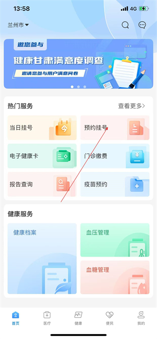 1、打开健康甘肃APP,在首页热门服务板块点击预约挂号。