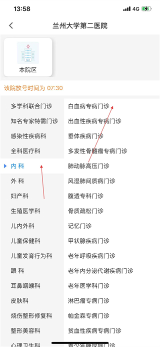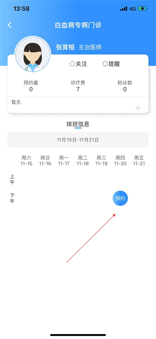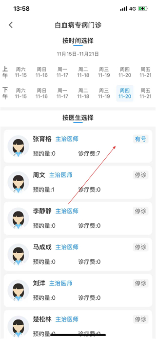 4、进入门诊页面后,选择就诊时间和有号的医生。