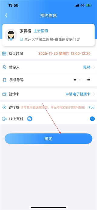 6、确认就诊人、手机号码等信息后,点击确定即可。