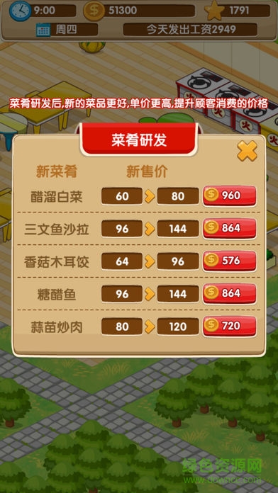 普通的菜肴赚的钱少,不断突破,研发新菜肴,顾客可以一饱口福的同时,你也会得到更丰厚的回报。研发的顺序由你做主