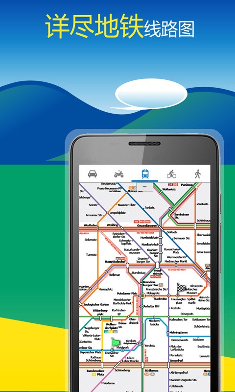 · 支持汽车导航、步行导航并提供当地地铁交通线路图。