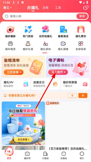 1、打开婚礼纪App进入首页点击电子请帖板块中的马上制作按钮,进入请帖制作选择页面。