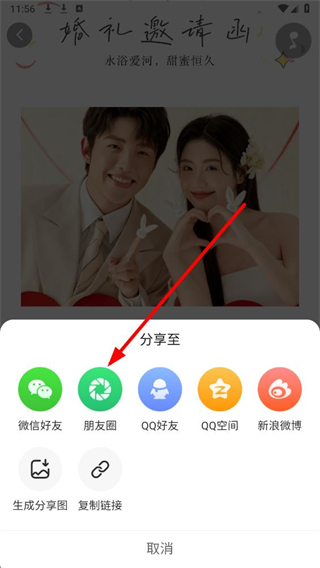 4、在分享菜单中,选择朋友圈选项,即可跳转至微信朋友圈发布界面,编辑后发布请帖内容。