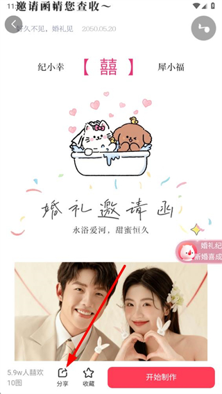 4、点击选中模板下方的开始制作按钮,进入编辑界面,按照提示上传照片、修改文字等信息,完成后即可生成专属婚礼邀请函。
