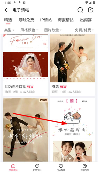 3、根据喜好从展示的众多婚礼邀请函模板中挑选心仪的模板,可依据类型、风格颜色、图片数量、免费付费等条件筛选。