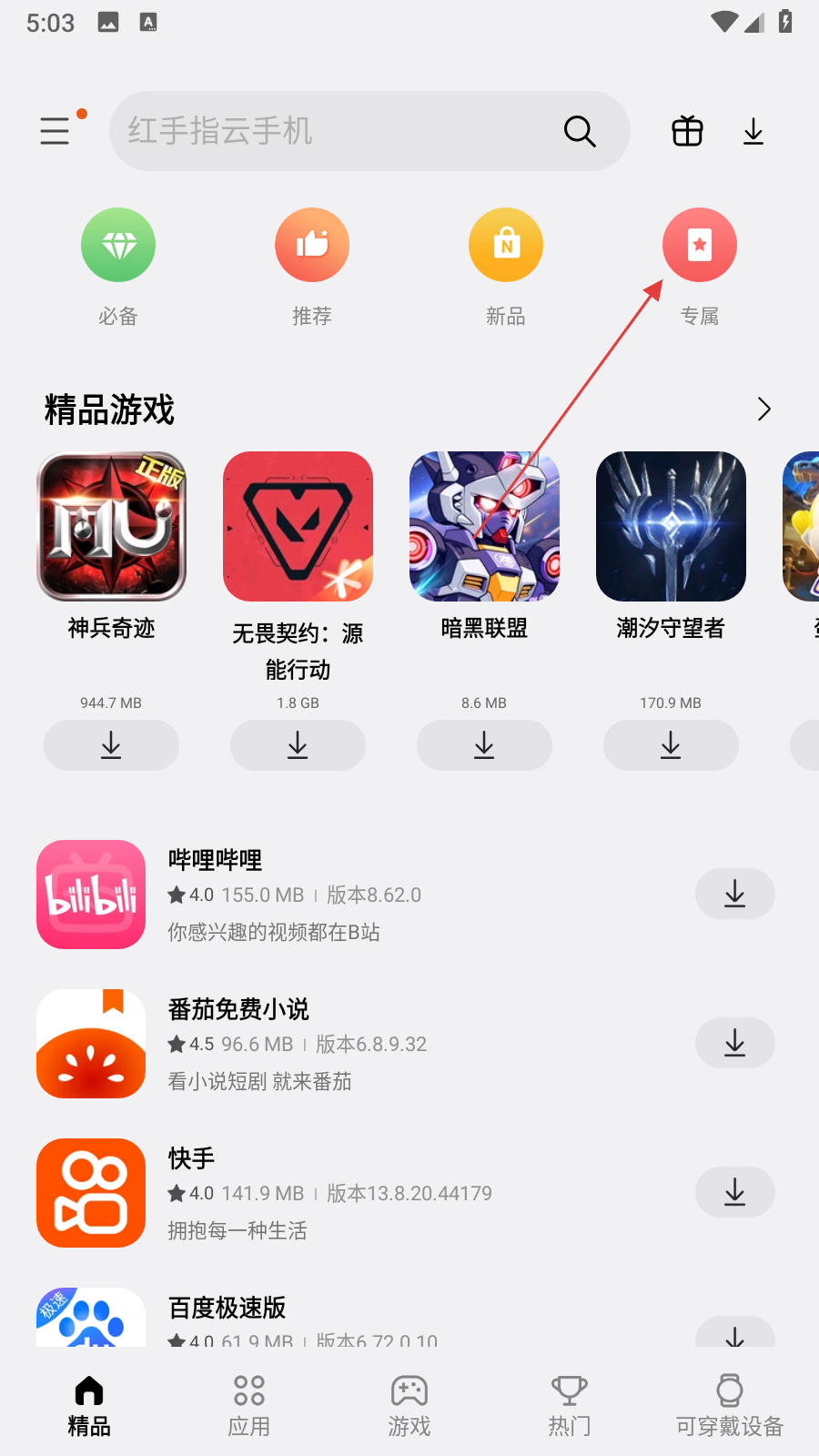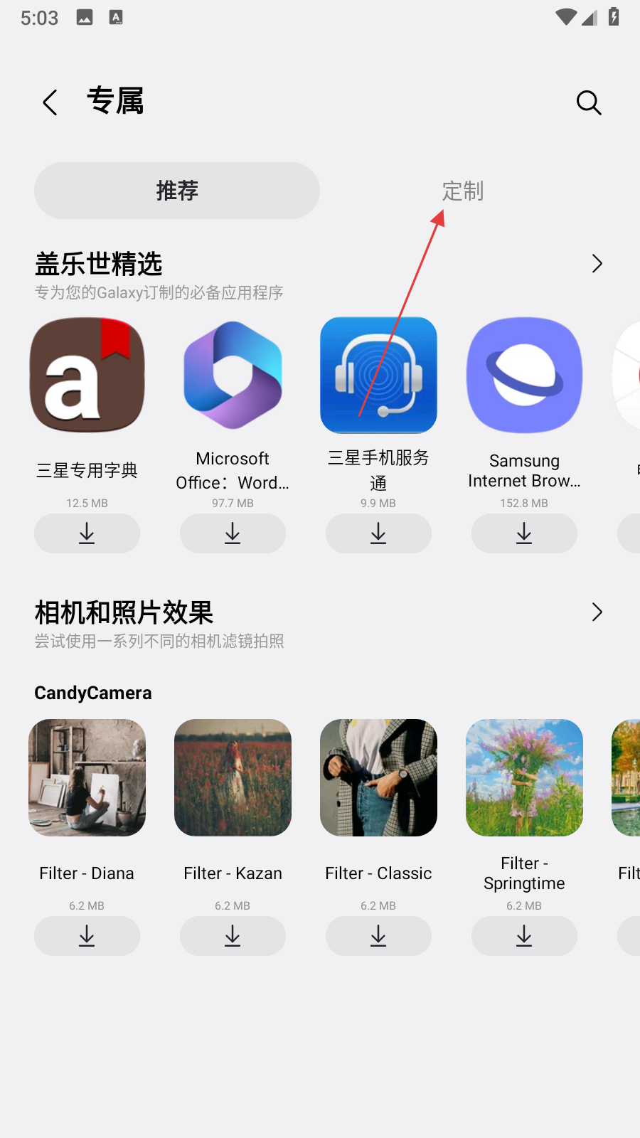 1、打开三星应用商城,在首页点击专属选项,进入专属页面。