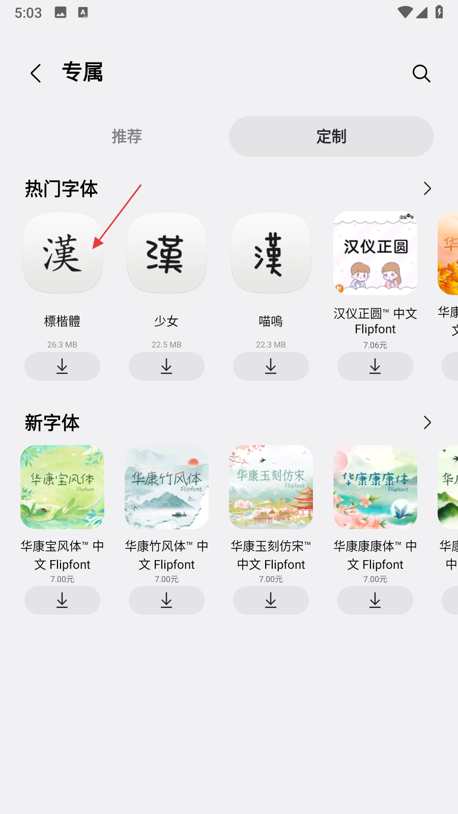 3、在定制界面里,找到热门字体区域,选择想要下载的字体,点击进入该字体的详情页面。