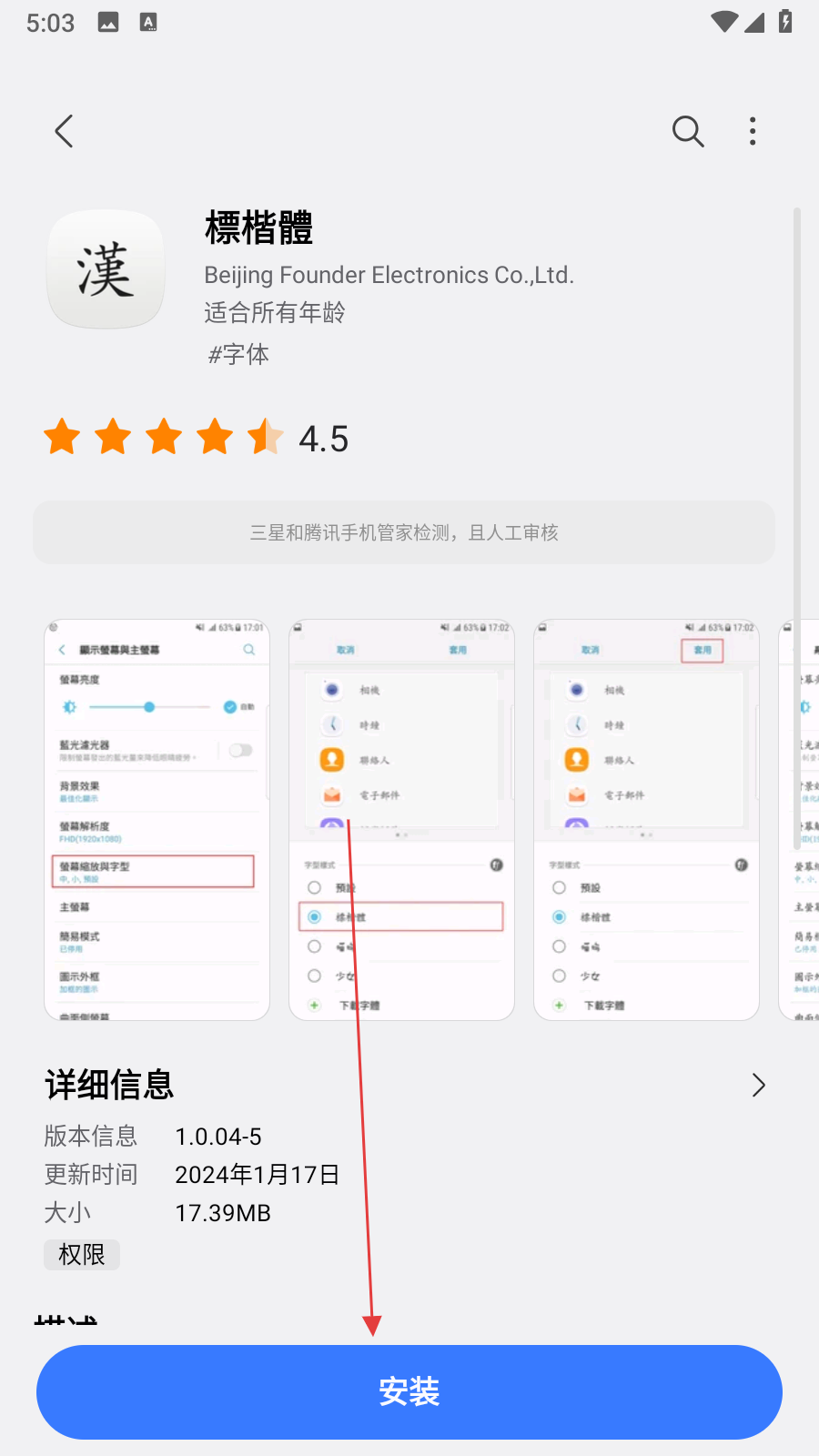 4、在字体详情页面,点击底部的安装按钮,等待下载安装完成即可。