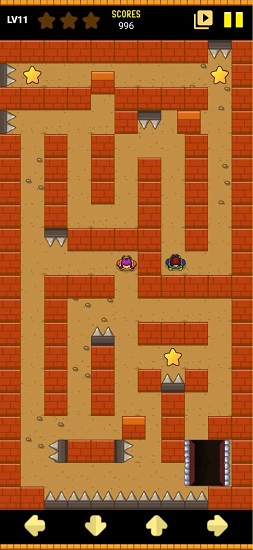 2、下方方向控制自己(蓝色小人),而心(红色小人)则朝着控制的反方向移动。