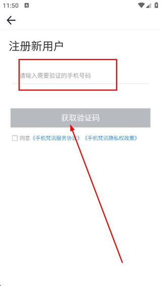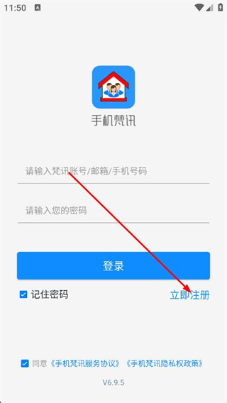 1、打开手机梵讯app,在登录界面点击右下角立即注册选项。