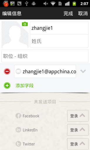 1、分享联系人:分享您的联系人信息;在Facebook、Twitter和LinkedIn上保持联系