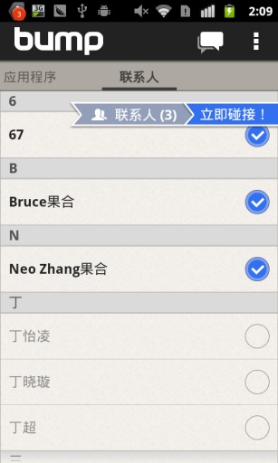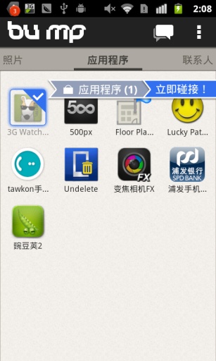 Bump碰碰乐是一款跨平台的极具创意的应用程序,利用它,你能够迅速的在两个手机之间共享照片、联系人和应用程序。只需选择要发送的内容,然后拿着手机,与另一 Bump 使用者手上拿的手机轻轻相碰。分享照片、应用程序和联系。相碰之后,可以继续随时随地发送消息,而且会即时通知,就像免费短信。