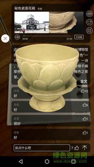 主要应用在各个博物馆中,可以通过本应用扫描场馆中的展品,动态显示简介,可以播放语音和3d的动画,更加生动的介绍展品信息。可以对展品发表评价,查看博物馆的动态信息等!