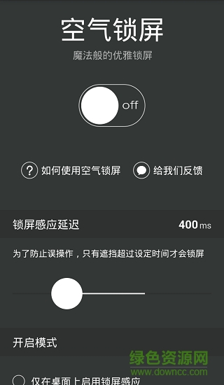 《空气锁屏》是一款你不用触摸手机,只需将手掌轻划过屏幕,手机屏幕就会如同感应到了你魔法的火焰一般自动熄灭的软件。魔法般的优雅锁屏,挥挥手隔空锁定屏幕。气锁屏以极优雅的方式锁屏,帮电源键起码延长了一半的寿命。