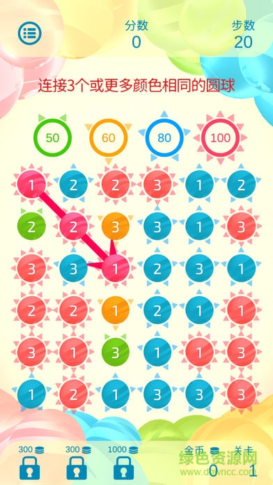 玩家可以自由连接圆球:垂直、水平或对角线。尽管游戏规则很简单,玩家只需要连接3个或更多相同颜色和数字的圆球,但Dual Match 3的独特之处在于不同的连接路径会导致分数大不相同。