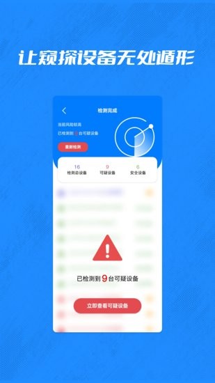 检测摄像头,检测针孔摄像头,排查多设备隐藏摄像头的针孔摄像头探测软件,防监控,防窃听,只要一键检测,就能让可疑的窥探设备露出原形。