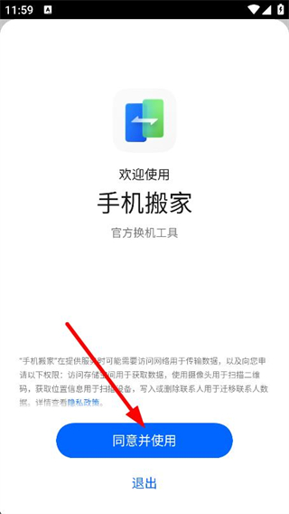 1、打开手机搬家,在欢迎页面点击同意并使用。