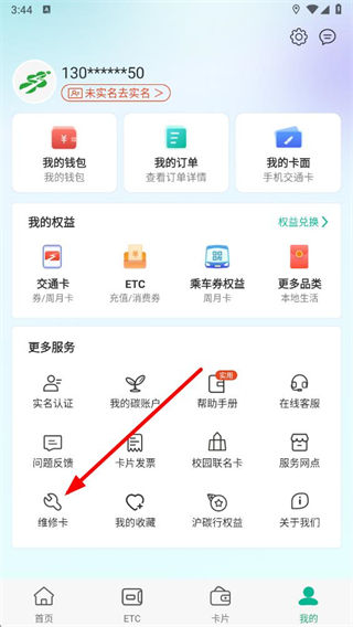 2、在我的页面,找到维修卡选项并点击,进入查询退卡的操作界面。