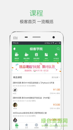 极客学院ios客户端是一款专注于互联网IT行业的职业教育培训软件,软件汇聚了国内顶尖大牛,最细致的入门课程带你进入IT的世界,喜欢的朋友可以到绿色资源网下载体验一下!