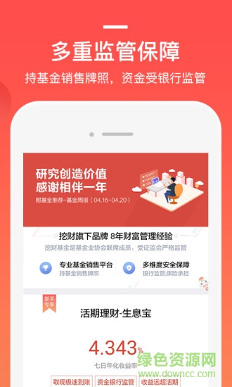 挖财基米安全吗?挖财基米手机版是由挖财官方推出的一款基金理财软件,提供了超多理财产品,投资门槛低资金由银行监管,随存随取更省心,没有手续费收取交易更放心,欢迎来绿色资源网下载!