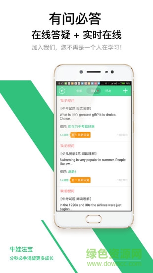 牛娃app是一款专为中小学生提供的英语、语文在线学习软件,汇聚中高考历年真题,一键拍照搜题、名师在线答疑等多种功能,让孩子随时随地都可以学习,来绿色资源网免费下载吧!