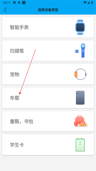 3、在选择设备类型页面,找到并点击车载选项,进入添加车载设备的界面。