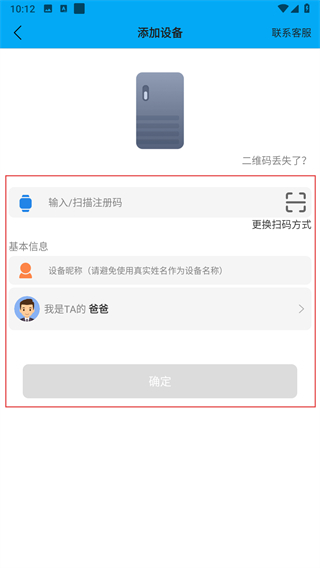 4、输入或扫描车载设备的注册码,填写设备昵称等信息后点击确定完成连接。