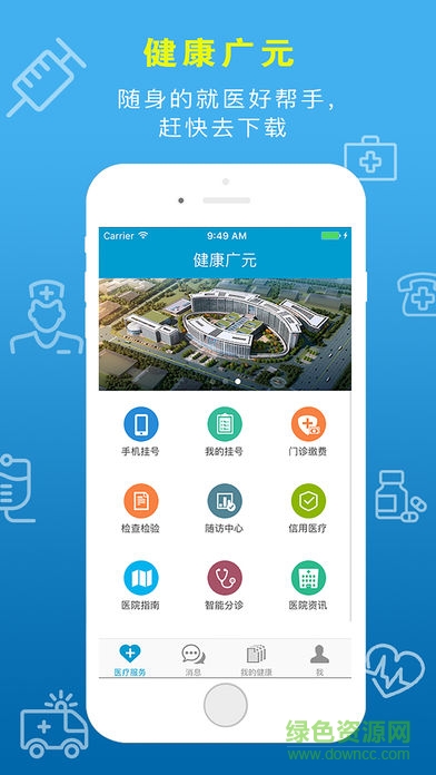 健康广元是一款专为广元市民打造的掌上健康app,手机挂号结合广元线下多家医院使用,健康小知识宣传专家坐诊可随时咨询一切健康问题,电子病历住院缴费医疗报销等全面服务。快来绿色资源网下载体验吧!