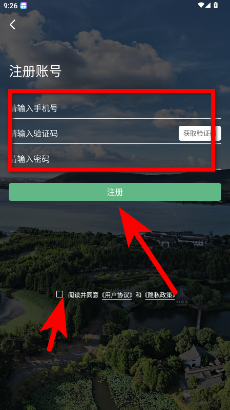 4、输入手机号、验证码、密码并勾选同意,点击注册按钮,即可完成注册流程。