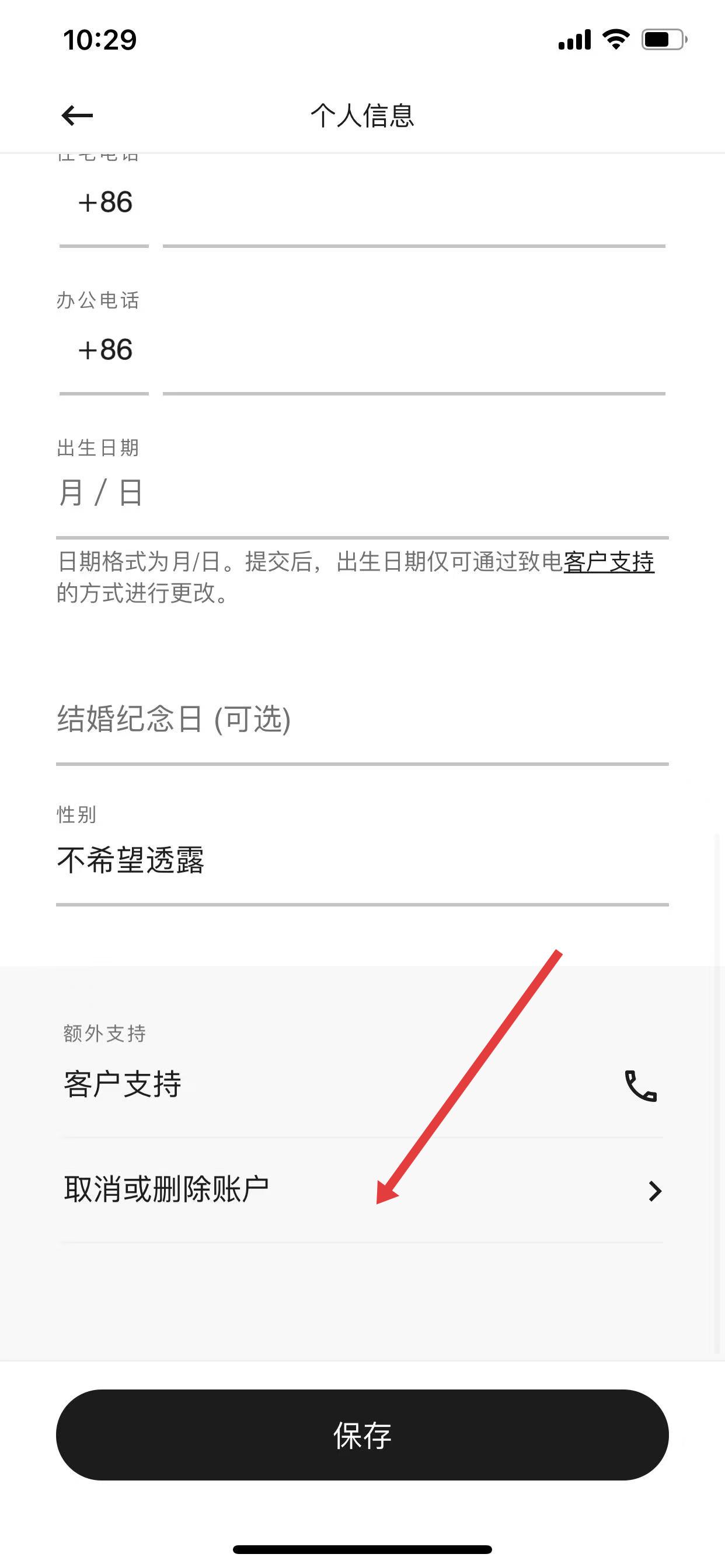 3、下滑个人信息页面,点击取消或删除账户。