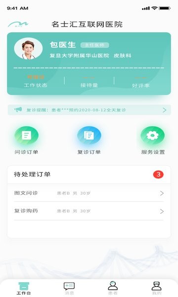 名士汇互联网医院医生端app带给大家全新的看诊操作,线上app帮助你管理预约的病人,一键操作就能和患者端互通信息,叫到谁的号码就可以快速看诊,不仅可以提神办公效率,还能后续跟踪用户的恢复情况,做到一手掌握,医生用户在这里可以对患者进行线上解答、复诊购药,轻松管理患者,需要的欢迎点击下载。