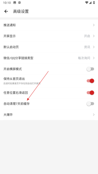 4、在高级设置界面,找到自动清理7天前缓存的开关,点击开启该功能。