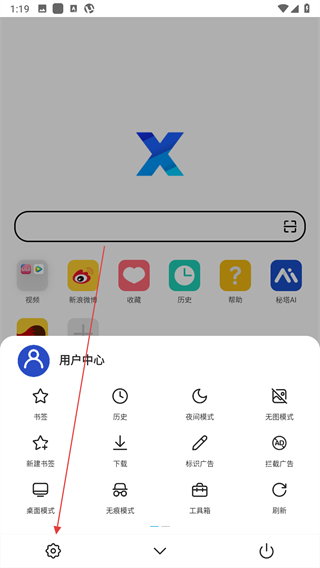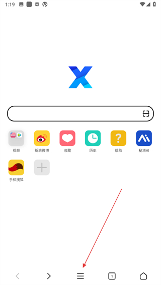 1、打开X浏览器主界面,点击底部导航栏中间的菜单按钮。