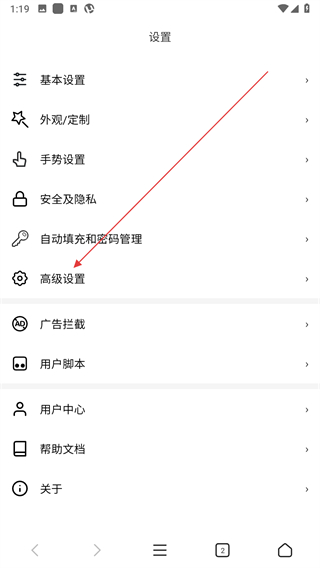 3、在设置页面中找到高级设置选项并点击,进入高级设置。