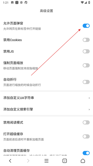 4、在高级设置页面中,点击允许页面弹窗对应的开关即可。