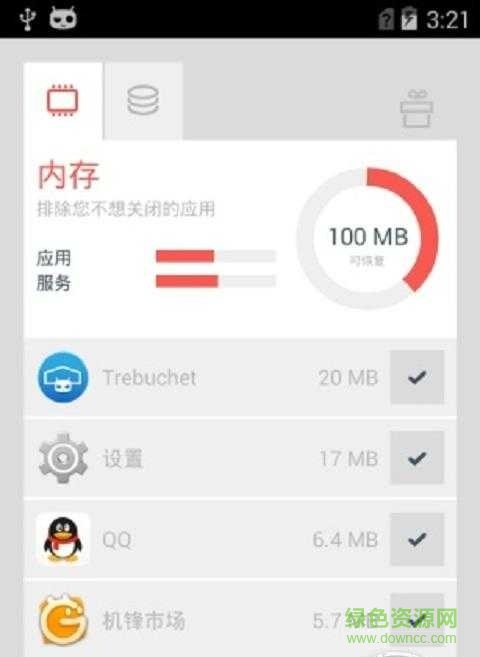 内存清理器是一款非常好用的手机内存垃圾清理软件,帮助清理手机中不必要的垃圾,并且可以帮助关掉不适用的后台应用程序,加快手机运行速度!喜欢的朋友可以到绿色资源网下载体验吧!