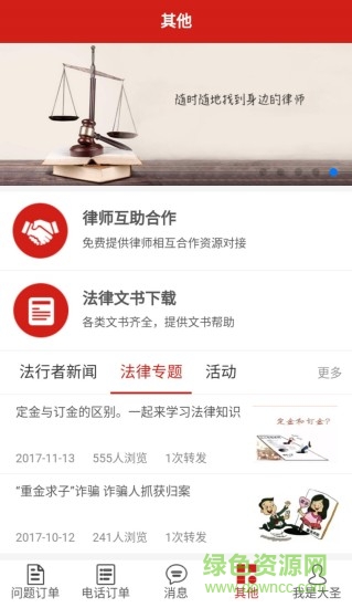 法行者app是一款专门为用户提供法律咨询服务的手机平台,众多专业资深律师全天在线为用户提供咨询服务,耐心解答用户的每一个法律纠纷问题,同时还能够为用户提供旅行援助服务,需要的用户快来绿色资源网下载吧!