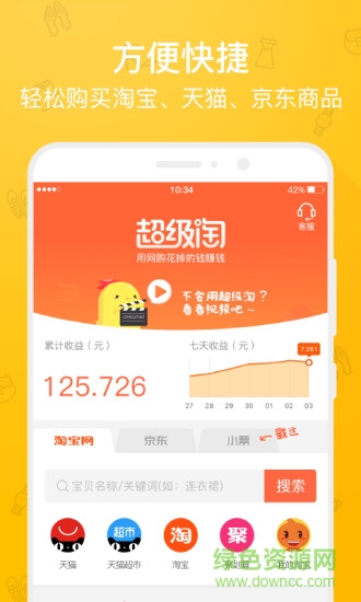 超级淘旧版本是一款非常方便的购物返利软件,通过这款软件,只要是在天猫、京东等等购物平台上下单购物就能获得返利,非常的方便实用,是爱购物的您的返利小助手!喜欢的朋友可以到绿色资源网下载体验吧!
