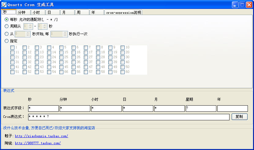 Quartz Cron生成工具是一款表达式生成软件,有了该表达式生成器只需要选择对应的“执行”时间就可以快速生成符合你要求的表达式啦!该软件界面简洁,操作方便,体积小巧,功能全面,欢迎下载体验!