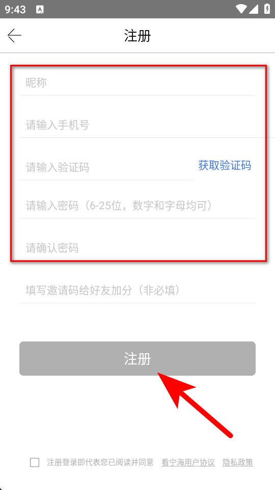 3.在注册页面填上昵称、用户名(手机号)、手机验证码、密码、邀请码,完成注册。用户在下载安装“看宁海”客户端后,必须完成注册,并在注册页面“邀请码”一栏输入西店镇指定的邀请码“96.0”。“看宁海”客户端系统后台将根据“邀请码”有效准确地识别各单位的推广情况。