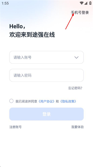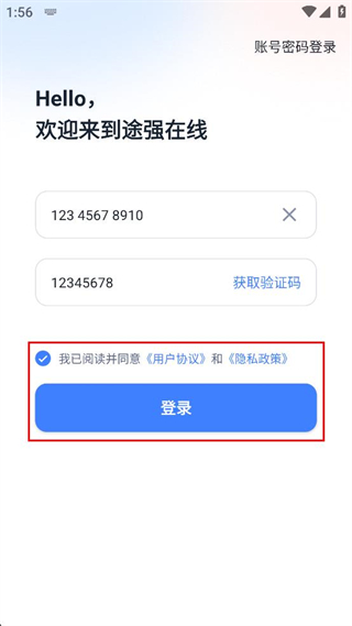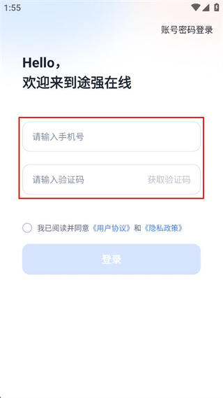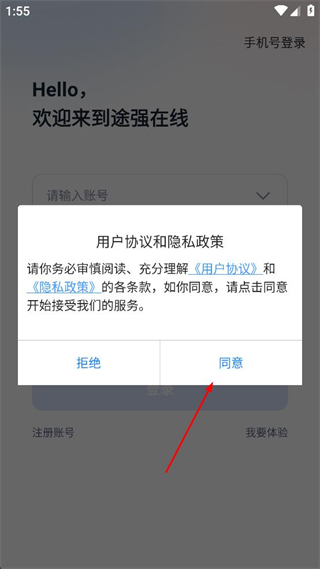 1、打开途强在线,阅读弹出的用户协议和隐私政策,点击同意按钮进入登录界面。