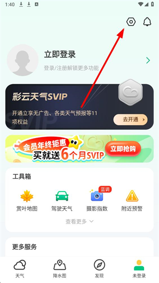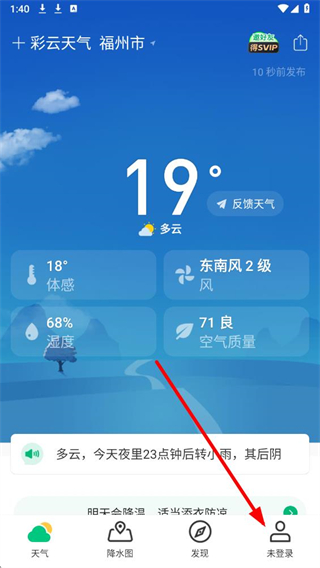 1、在彩云天气app界面底部,点击未登录选项进入个人相关页面。