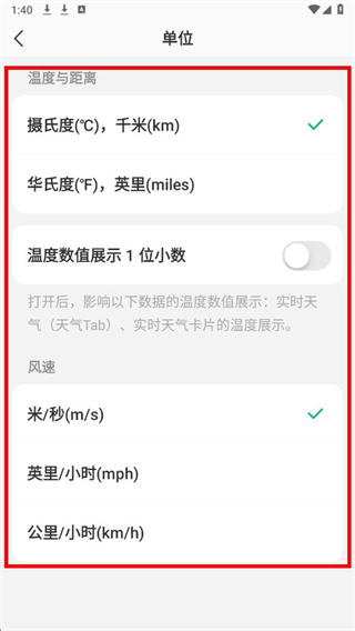 4、在界面可选择温度与距离的单位组合、开启温度小数展示,以及切换风速单位,按需调整后即可完成设置。