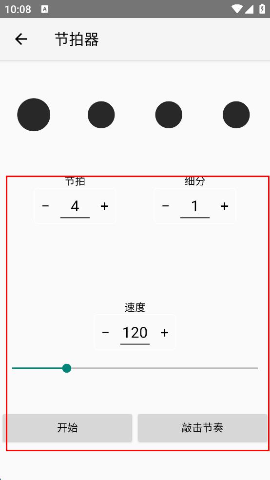 4、在节拍器页面,可通过“-”“+”按钮调节节拍、细分以及速度数值。