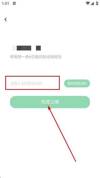 3、输入收到的验证码,点击完成注册,即可完成注册。