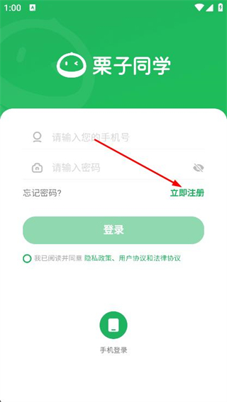1、打开栗子同学APP,在登录页面点击立即注册选项。