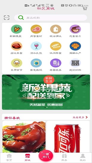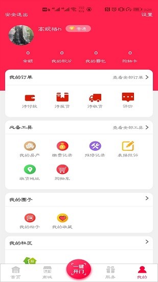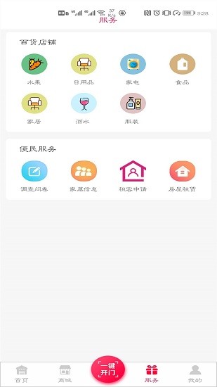我的房产,缴费记录,报修记录,房屋租赁,百货店铺,果蔬肉食,零食美食;