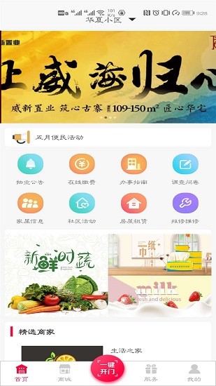 是小区物业管理软件,包含物业公告,在线物业缴费,房屋租赁、物业维修一键开门,商城商品购买等功能。